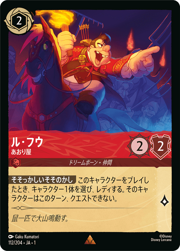 そそっかしいそそのかし このキャラクターをプレイしたとき、キャラクター1体を選び、レディする。そのキャラクターはこのターン、クエストできない。