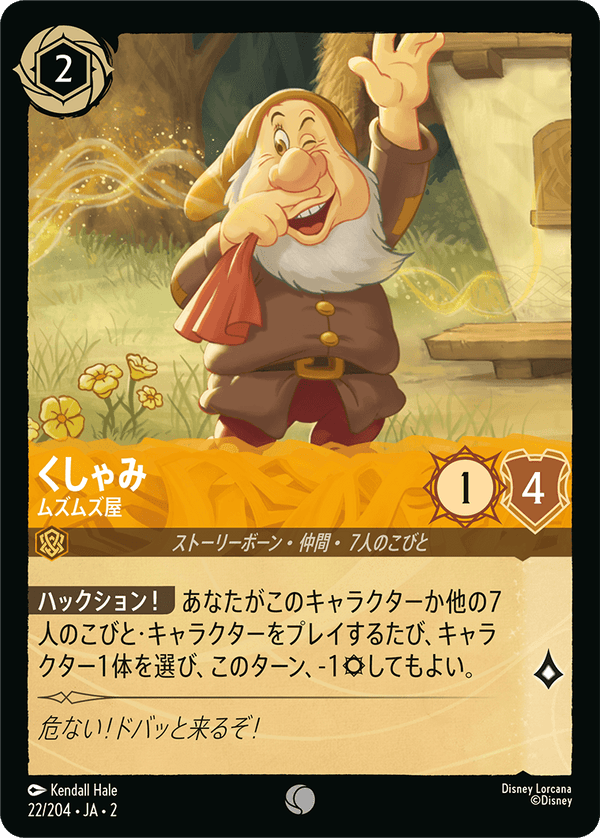 ハックション! あなたがこのキャラクターか他の7人のこびと・キャラクターをプレイするたび、キャラクター1体を選び、このターン、-1してもよい。