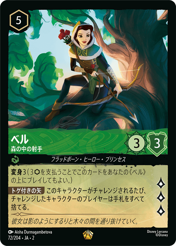 トゲ付きの矢 このキャラクターがチャレンジされるたび、チャレンジしたキャラクターのプレイヤーは手札をすべて捨てる。