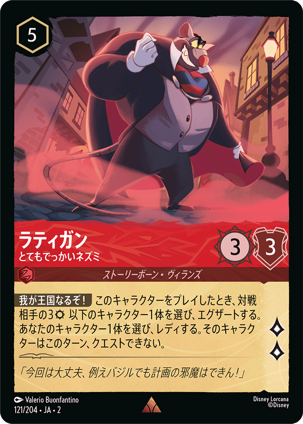 我が王国なるぞ! このキャラクターをプレイしたとき、対戦相手の3以下のキャラクター1体を選び、エグザートする。あなたのキャラクター1体を選び、レディする。そのキャラクターはこのターン、クエストできない。