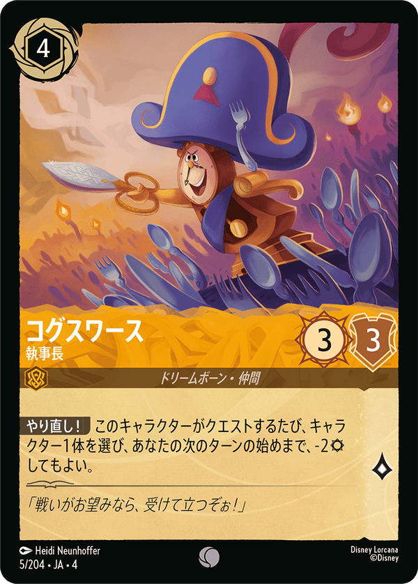 やり直し! このキャラクターがクエストするたび、キャラクター1体を選び、あなたの次のターンの始めまで、-2してもよい。