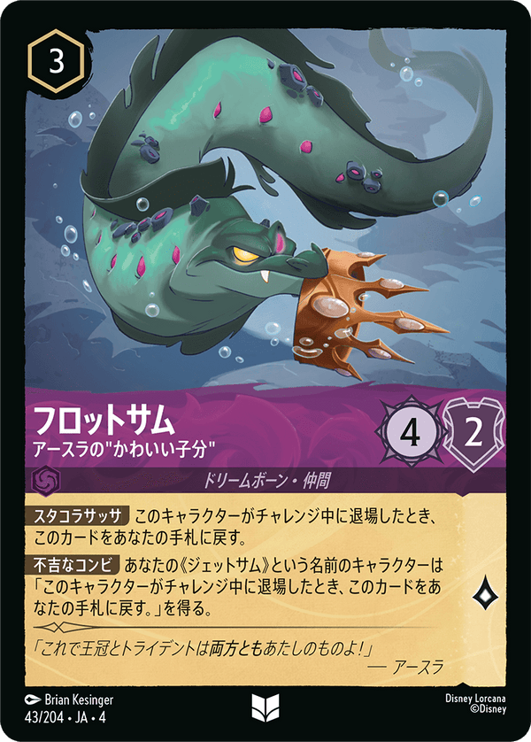 不吉なコンビ あなたの《ジェットサム》という名前のキャラクターは「このキャラクターがチャレンジ中に退場したとき、このカードをあなたの手札に戻す。」を得る。