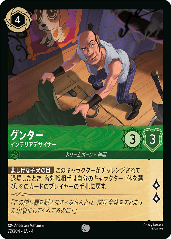 悲しげな子犬の目 このキャラクターがチャレンジされて退場したとき、各対戦相手は自分のキャラクター1体を選び、そのカードのプレイヤーの手札に戻す。