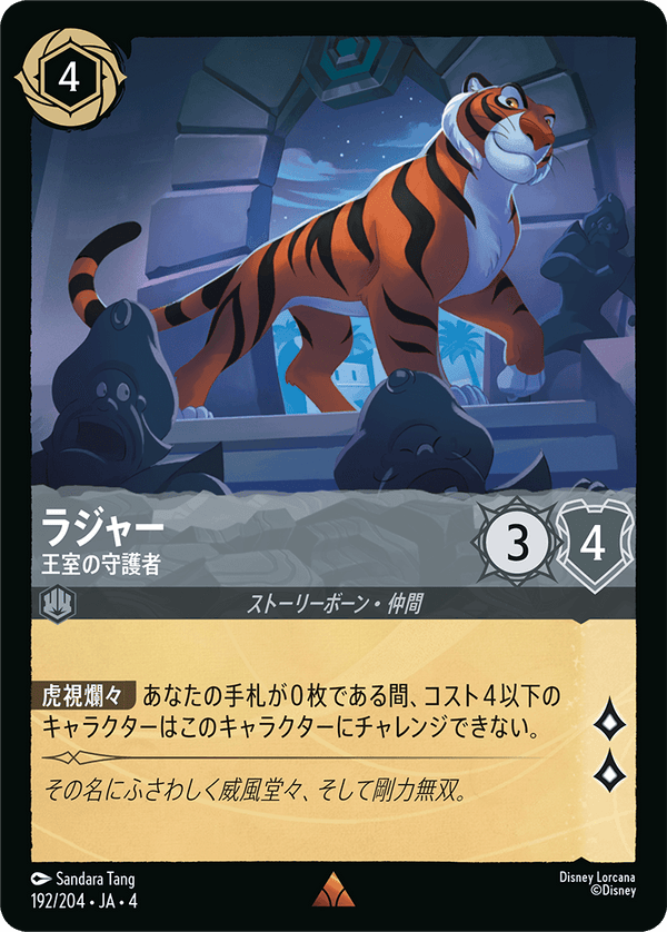 虎視爛々 あなたの手札が0枚である間、コスト4以下のキャラクターはこのキャラクターにチャレンジできない。