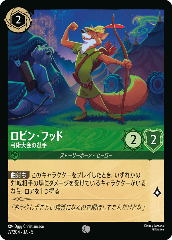 曲射ち このキャラクターをプレイしたとき、いずれかの対戦相手の場にダメージを受けているキャラクターがいるなら、ロアを1つ得る。