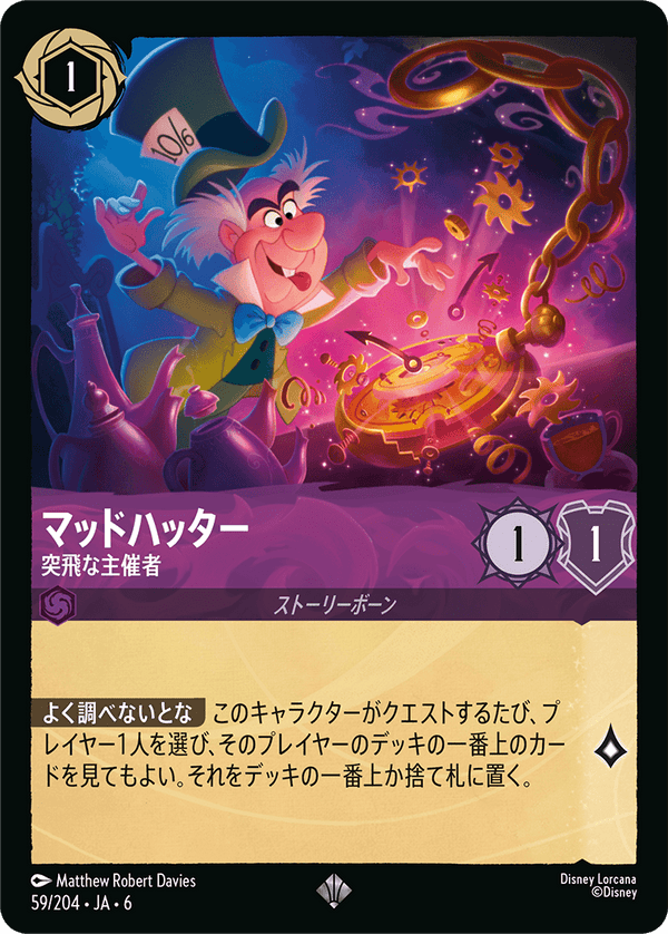 よく調べないとな このキャラクターがクエストするたび、プレイヤー1人を選び、そのプレイヤーのデッキの一番上のカードを見てもよい。それをデッキの一番上か捨て札に置く。