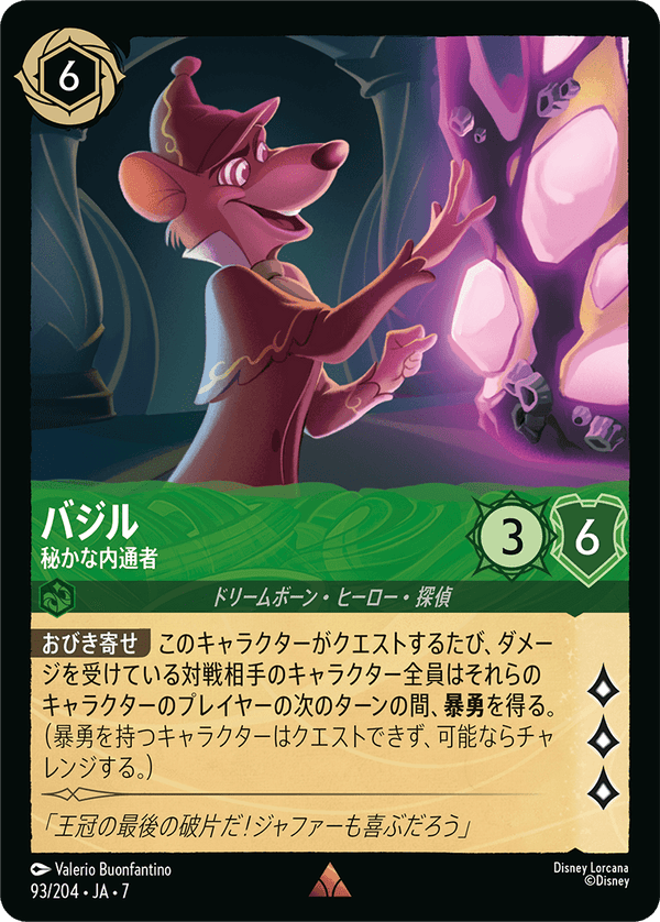 おびき寄せ このキャラクターがクエストするたび、ダメージを受けている対戦相手のキャラクター全員はそれらのキャラクターのプレイヤーの次のターンの間、暴勇を得る。(暴勇を持つキャラクターはクエストできず、可能ならチャレンジする。)