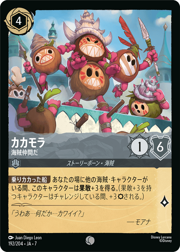 乗りカカった船 あなたの場に他の海賊・キャラクターがいる間、このキャラクターは果敢+3を得る。(果敢+3を持つキャラクターはチャレンジしている間、+3される。)